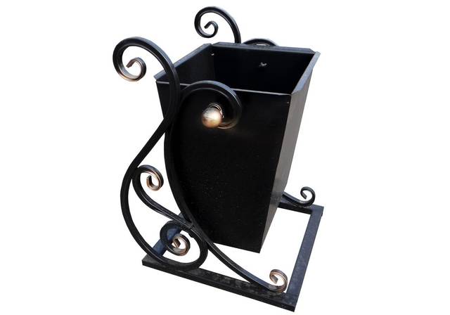 Кованая уличная урна ЛОТОС. Имеет оригинальный дизайн и в тоже время классический внешний вид уличной урны. Способ установки стационарный, с возможностью крепления анкерными болтами к поверхности установки. Основной бак урны имеет систему опрокидывания, для более быстрой и легкой очистки от мусора. Толщина стали мусорного бака 1,1 мм, с элементами художественной ковки Урна окрашена в классический черный цвет, после обработки грунтом